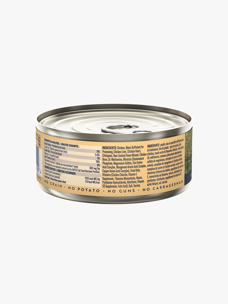 Chicken, Water Sufficient for Processing, Chicken Liver, Chicken Heart, Chick Peas, New Zealand Green Mussel, Chicken Bone, DL-Methionine, Minerals (Dipotassium Phosphate, Magnesium Sulfate, Zinc Amino Acid Complex, Manganese Amino Acid Complex, Copper Amino Acid Complex), Dried Kelp, Vitamins (Choline Chloride, Vitamin E Supplement, Thiamine Mononitrate, Niacin, Pyridoxine Hydrochloride, Riboflavin, Vitamin D3 Supplement, Folic Acid), Salt, Taurine.