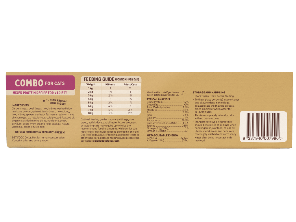 Combo for Cats is a mixed protein recipe containing, chicken, beef, lamb and Tasmanian Salmon. With more tasty forms of protein than your cat could dream of, this combination recipe is truly a mouthful! Containing the goodness of muscle meat, vitamin and mineral-rich offal, fresh seasonal vegetables plus more, your feline friend is bound to be purring with delight.